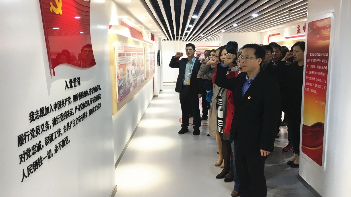 在高悬的党旗下,全体党员在檀庄龙书记的带领下,举起右拳,高声宣读入党誓词,表达不忘初心,牢记使命,以新的面貌砥砺奋进,推动党的十九大精神在集团内落地生根,增强党员“四个意识”,争当新时代中国特色社会主义排头兵。