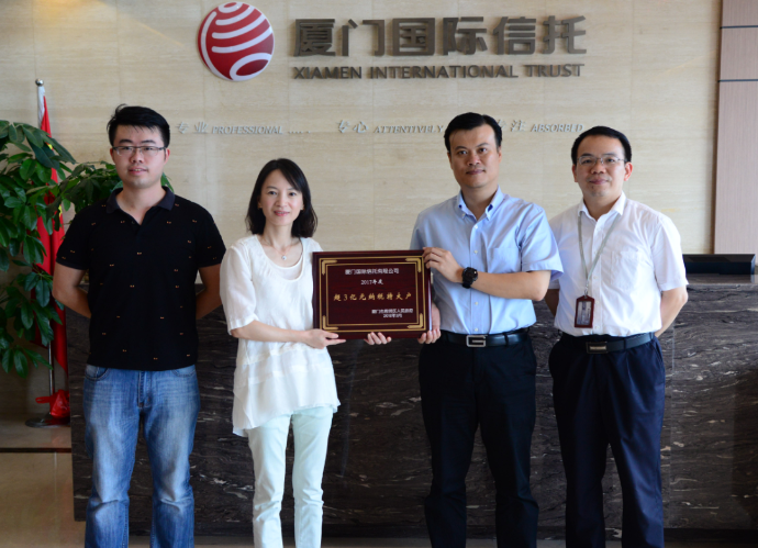 7月4日上午,思明区筼筜街道办陈小颖副主任率队走访厦门国际信托,介绍思明区有关优惠政策,了解公司经营动态,并授予厦门国际信托思明区2017年度“超3亿元纳税特大户”。
