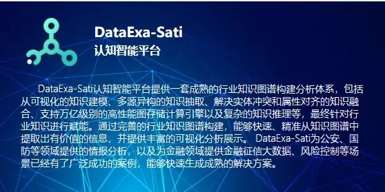 DataExa-Sati认知智能平台荣获工信部2018“星河(Galaxy) 奖”优秀大数据产品奖,为国内首家通过且唯一一家全项通过工信部信息通信研究院发起的“知识图谱行业标准功能评测”的产品。
