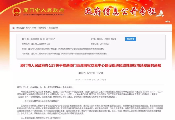 2019年11月,厦门市人民政府出台《关于推进厦门两岸股权交易中心建设促进区域性股权市场发展的通知》,明确支持厦门两岸股权交易中心建设特色板块,探索成为台资企业赴大陆上市、台海资本对接的有效通道,促进科技创新型企业获得多层次资本市场服务,为创业板和科技板市场孵化培育企业。