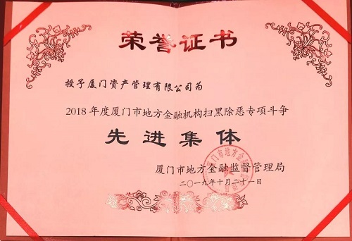 厦门资产管理有限公司荣获厦门市地方金融机构扫黑除恶专项斗争先进集体。截至2019年底,厦门资管实现营收超3亿元,利润总额超2亿元,新增收购不良债权规模超180亿元,营收、利润、收购规模再创新高。