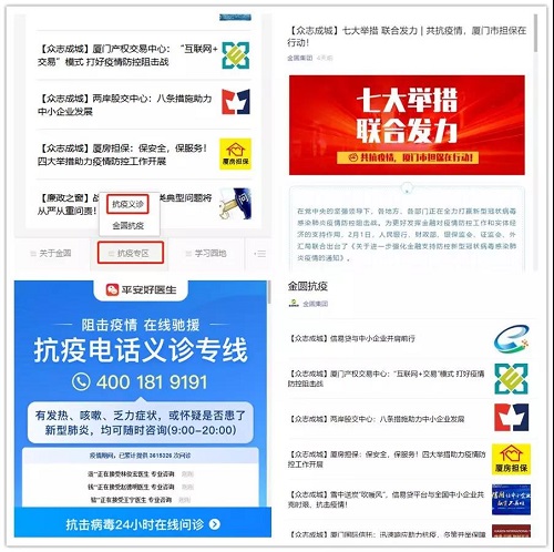 自疫情发生以来,集团充分利用微信公众号、工作微信群、楼宇电视等新媒体平台,在微信公众号开辟《抗疫专区》专栏,引入“平安好医生”即时义诊服务,发布《众志成城》系列报道、《疾病预防》系列报道、《圆法专栏》系列报道等抗疫文章30余篇,提高员工科学防疫意识。
