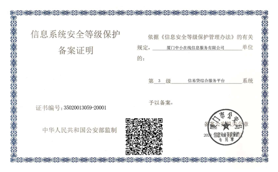 通过信息系统安全三级测评并取得等级保护备案证明,是对中小在线和全国信易贷平台网络信息规范化管理能力、信息安全保障能力等方面的充分肯定,确认了平台满足公安机关和监管部门对信息系统的安全和稳定的要求,将能有效保证用户的信息和隐私安全。