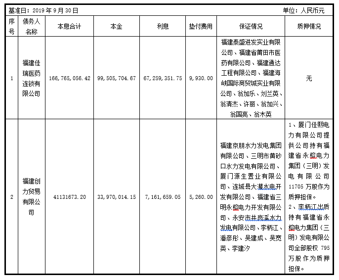 本次公告不良资产共2户,截止2019年9月30日,该资产债权总额207,896,729.62元,另有代垫费用15,190.00元。债权资产基本信息如下表: