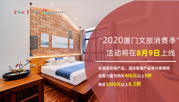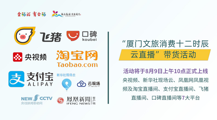 8月9日起,通过央视频、新华社现场云、凤凰视频,淘宝直播间、支付宝直播间、飞猪直播间、口碑直播间等7大平台将同步直播,促销厦门康养度假、养生美食等旅游产品。游客和市民还可在飞猪平台上领取厦门文旅消费优惠折扣券,购买酒店住宿产品可享受400元以上9折、1000元以上8.5折的优惠。