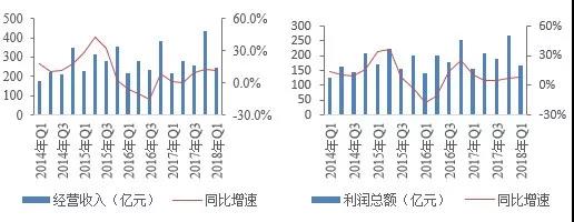 图5 2014年Q1—2018年Q1季度经营收入、利润总额及其同比增速