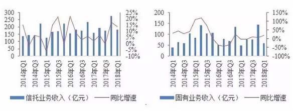 图6 2014年Q1—2018年Q1季度信托业务收入、固有业务收入及其同比增速