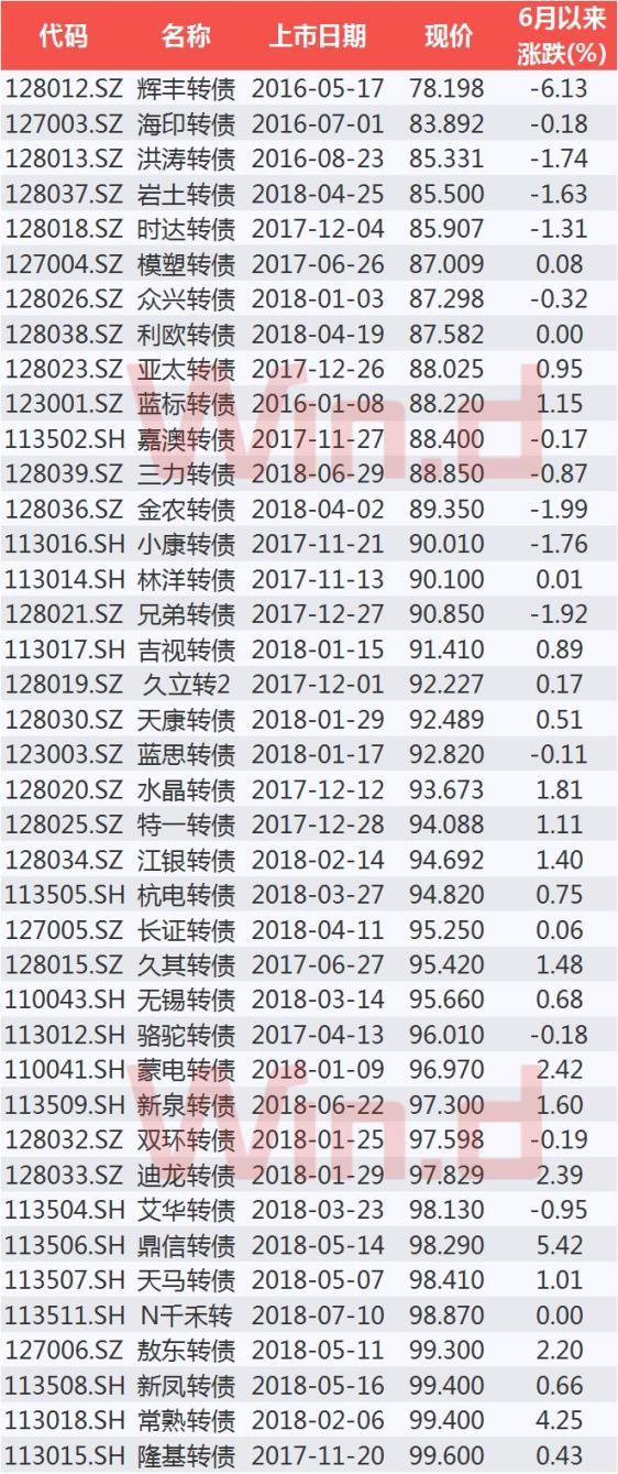 个股的下跌直接传导至可转债市场。数据显示,截至7月10日收盘,72只可正常交易的可转债中,有40只跌破100元面值。其中,辉丰转债6月以来跌幅达到6.13%,目前面值仅为78.198元,也是唯一一只跌破80元面值的可转债。