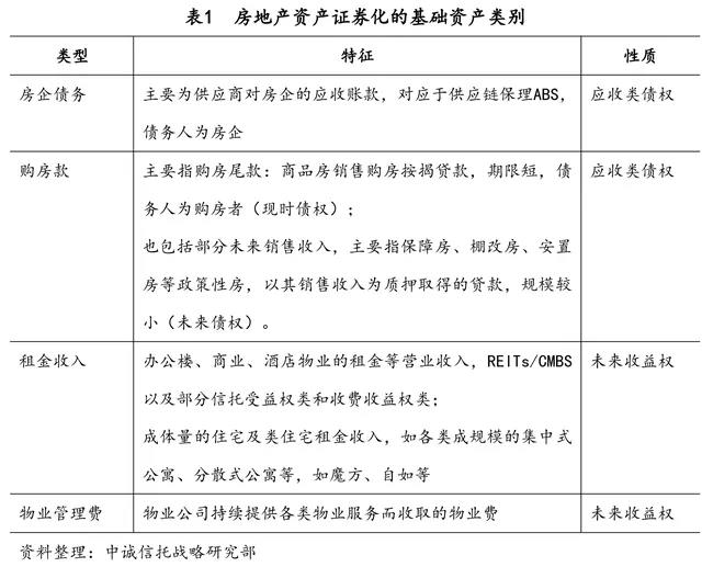 通常来讲,房地产资产证券化的基础资产主要包括:房地产企业债务、购房尾款、租金收入(包括商业类物业与住宅)、物业管理费等,其中房地产企业债务与购房尾款属于应收类债权,租金收入和物业管理费属于未来收益权。通过将这些资产证券化的方式,可以有效盘活房企资产,获取更多资金支持。