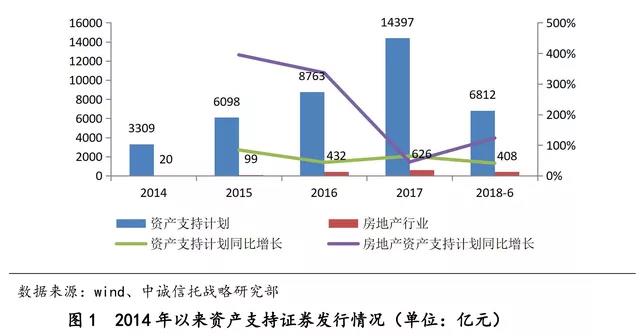 根据wind数据统计来看,从2014年以来,包括房地产在内的各类资产证券化(包括ABS和ABN)规模快速增长。从图1中可以看到,2014年全部资产支持证券发行规模3309亿元,而房地产行业仅为20亿元,占比只有0.6%;到了2017年全部资产支持证券规模都达到1.44万亿元,是2014年的4.8倍,房地产行业发行规模达到626亿元,是2014年的31.3倍,占比已经提升至4.35%。从增长率来看,2014年至2017年资产支持证券规模复合增长率年均达54%,而房地产行业复合增长率年均高达212%。2018年上半年,房地产行业资产支持证券发行规模已达到408亿元,同比增长达到123%。