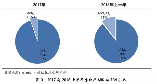 资产支持证券的产品类型主要有两类:一类是在交易所发行的ABS,,另一类是在银行间市场发行的ABN。目前,房地产资产证券化的产品类型主要以交易所发行的ABS为主。如图3所示,房地产行业资产支持证券2017年发行的626亿元规模中,ABS为593亿元,占比95%;2018年上半年408亿总规模中,ABS总规模为365亿元,占比89%。尽管ABS占据绝大多数,但ABN在2018年的发展速度明显加快。