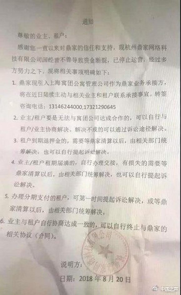 8月20号,杭州鼎家贴出一纸通知,宣布破产,导致约有4000户租客受损。鼎家公司办公室主任周锋淼告诉记者,他们大部分员工已经离职,公司正在筹集资金,接下来,会对债务问题进行核算。