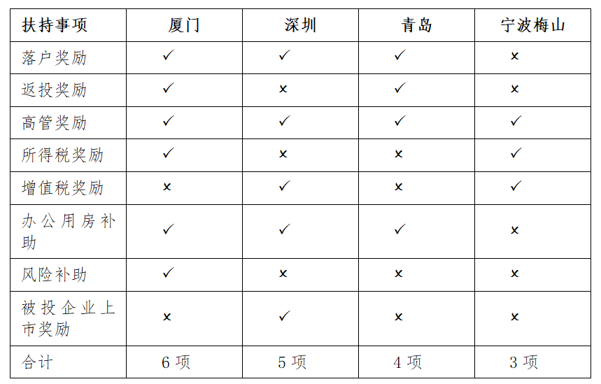 厦门政策对于常见的扶持优惠事项覆盖面较广,特别是在实操中基金较为看重的落户奖励、高管奖励、所得税奖励三个核心事项做到了全覆盖。