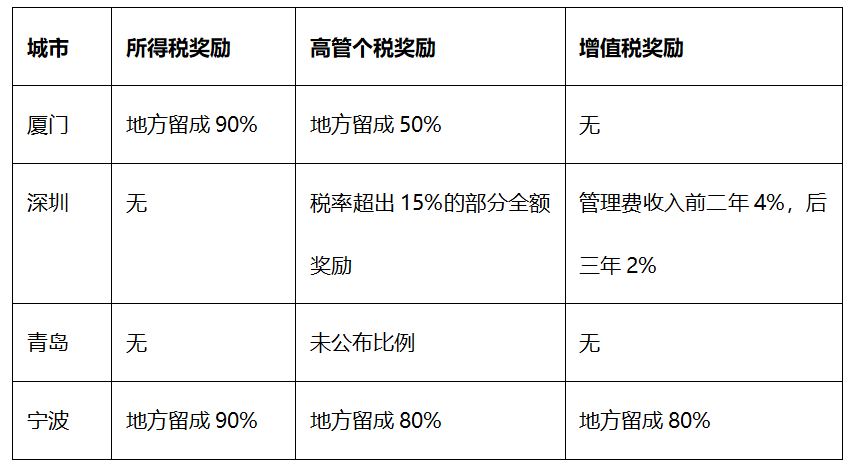 税收奖励(所得税奖励+高管个税奖励+增值税奖励):厦门政策在基金最为关心的所得税奖励方面保持了地方留成90%的高奖励比例。