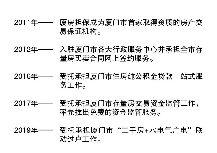 厦门市住房置业融资担保有限公司(简称厦房担保)成立于2001年1月,是为了配合住房制度改革,经厦门市政府批准成立的厦门市唯一一家国有大型房地产交易服务机构,专业从事个人住房贷款担保及房屋交易代办等服务。