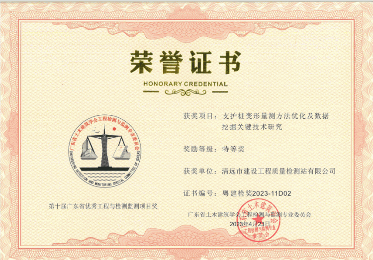 据悉,“广东省优秀工程与检测监测项目奖” 由广东省土木建筑学会工程检测与监测专业委员会主办,是广东省工程检测与监测行业的省级奖项,设有特等奖、创新奖和优秀奖等类别,每两年评选一次,评选项目主要为岩土工程、建筑结构、环境与设备、建筑节能等各个领域的创新性检测、监测新技术和新方法,对推动工程建设行业技术发展具有重大影响。