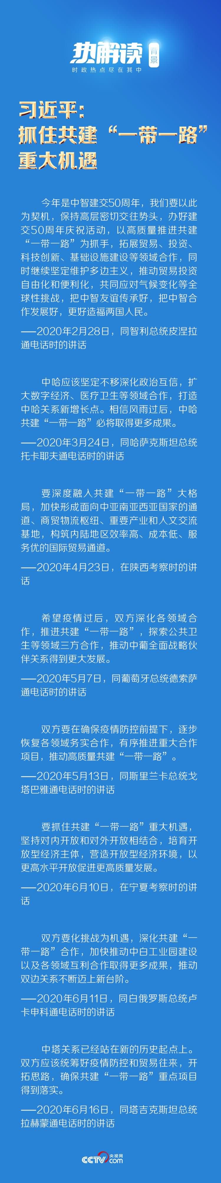 习近平主席在致辞中指出,我们愿同合作伙伴一道,把“一带一路”打造成团结应对挑战的合作之路、维护人民健康安全的健康之路、促进经济社会恢复的复苏之路、释放发展潜力的增长之路。