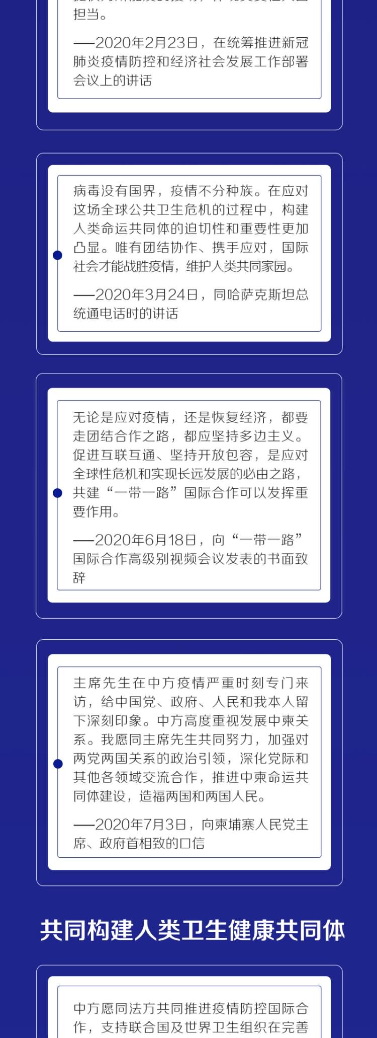 “中柬是守望相助的好邻居、好伙伴。新冠肺炎疫情发生后,中柬双方相互支持、密切合作,齐心协力抗击疫情并取得重大阶段性成果,用实际行动诠释了中柬命运共同体的牢不可破。”7月3日,习近平主席向柬埔寨人民党主席、政府首相洪森致口信。