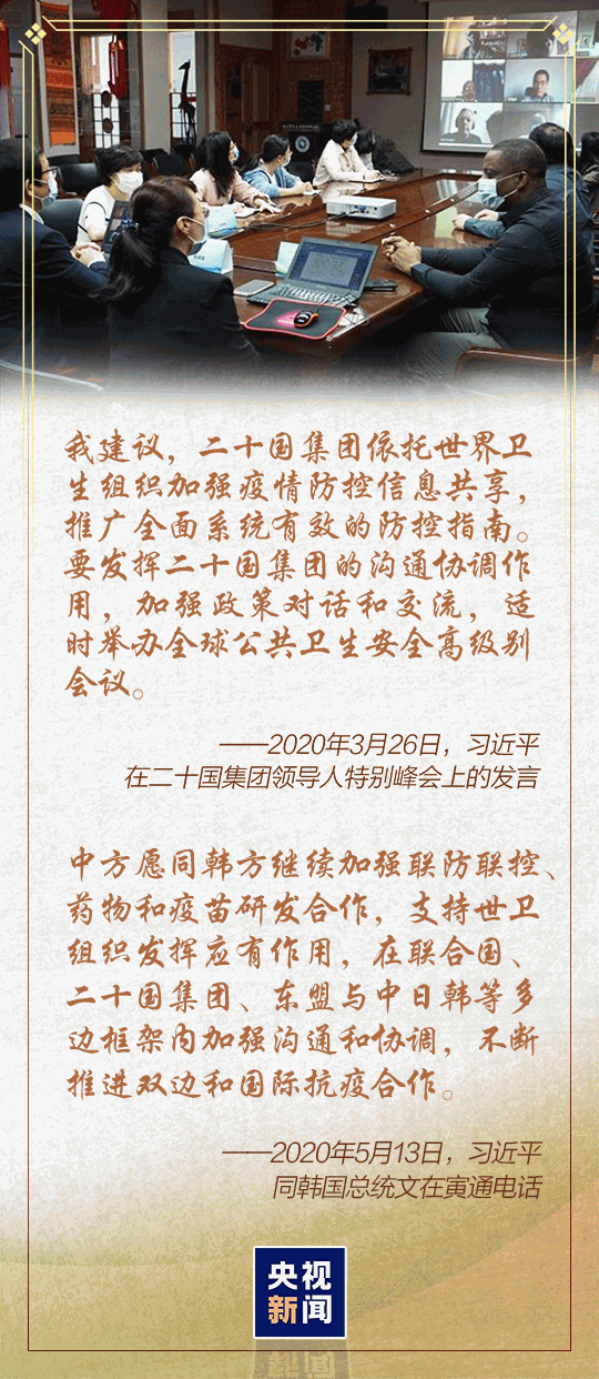 3月26日晚举行的二十国集团领导人特别峰会上,习近平主席宣布“同各国分享防控有益做法,开展药物和疫苗联合研发”“探讨建立区域公共卫生应急联络机制”“加大向国际市场供应原料药、生活必需品、防疫物资等产品”……
