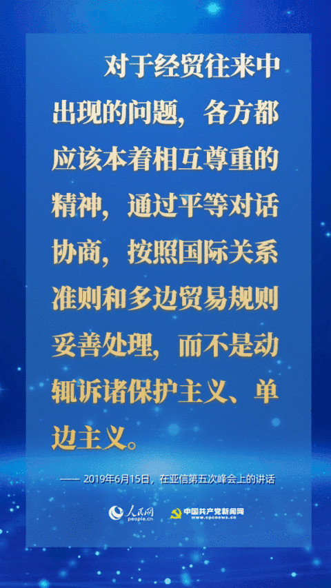 我们将坚定践行多边主义,维护以国际法为基础的国际秩序。中方愿同各国一道,秉持共商共建共享的全球治理观,坚定维护以联合国为核心的国际体系,坚定维护以世界贸易组织为核心的多边贸易体制。 对于经贸往来中出现的问题,各方都应该本着相互尊重的精神,通过平等对话协商,按照国际关系准则和多边贸易规则妥善处理,而不是动辄诉诸保护主义、单边主义。中国的这一立场,不仅是在维护各国的正当发展权利,也是在维护国际公平正义。