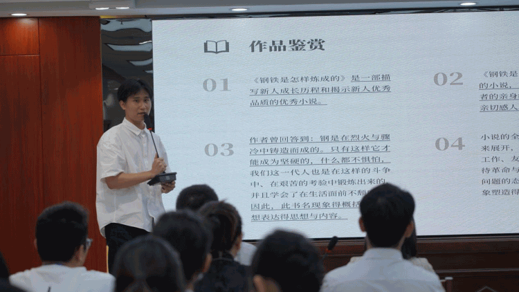 轮流上台,向现场观众推荐《毛泽东自传》《平凡的世界》《父父子子》《浴血荣光》等著名作品,有的介绍人物角色的经历和美好品德,有的分享读书过程中引发的感悟,有的赞美中华民族精神的传承与发展……台上选手们声情并茂、真情流露的动情分享,引起了现场评委和观众的强烈共鸣,现场响起一阵又一阵的掌声。
