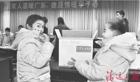 (打开“温暖包”,孩子们迫不及待的换上新棉衣。)