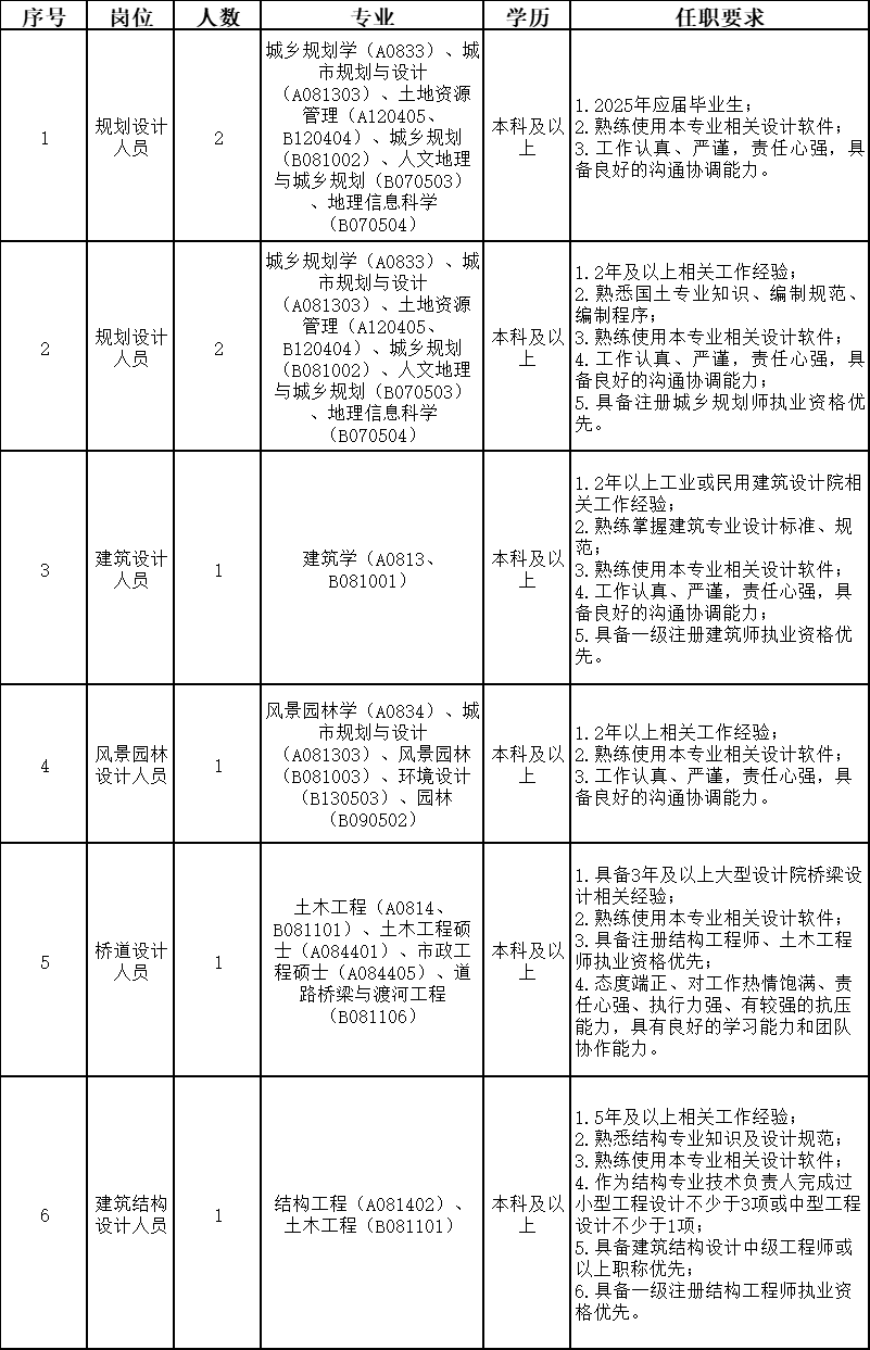 清远市城乡规划设计院有限公司创建于1991年,前身为清远市城建规划设计室、清远市城乡规划设计院,现有股东共2名,分别为广东省建筑设计研究院集团股份有限公司、清远市3044永利集团投资集团有限公司,属于国有企业性质。清远市城乡规划设计院有限公司充分投入到清远市城市化建设发展进程中,曾主导燕湖新城东片区域城市设计、高铁站城市设计、省职教城地块、清远市委党校、桥北路工程、清远市四馆广场、清远市体育公园等项目。根据公司业务发展的需要,现面向社会公开招聘相关专业人才,有关事项公告如下。